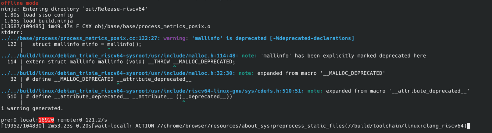 treat_warnings_as_errors=false: By default, Chromium ensures its code to be warning-free by turning compiler warnings into errors. However, the RISC-V port is currently not warning-free and thus we need this flag.use_debug_fission=false: This is a workaround for-gsplit-dwarf is unsupported with RISC-V linker relaxation (-mrelax).chrome_pgo_phase=0: Chromium distributes PGO profiles and would enable PGO by default. I am not sure whether using the bundled PGO profiles that are originally generated on X86-64 for our RISC-V cross-compilation is a good idea so I disabled it.